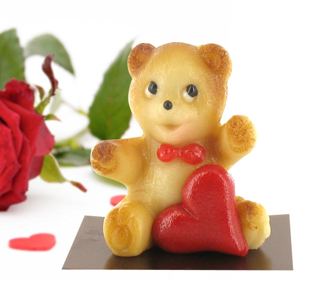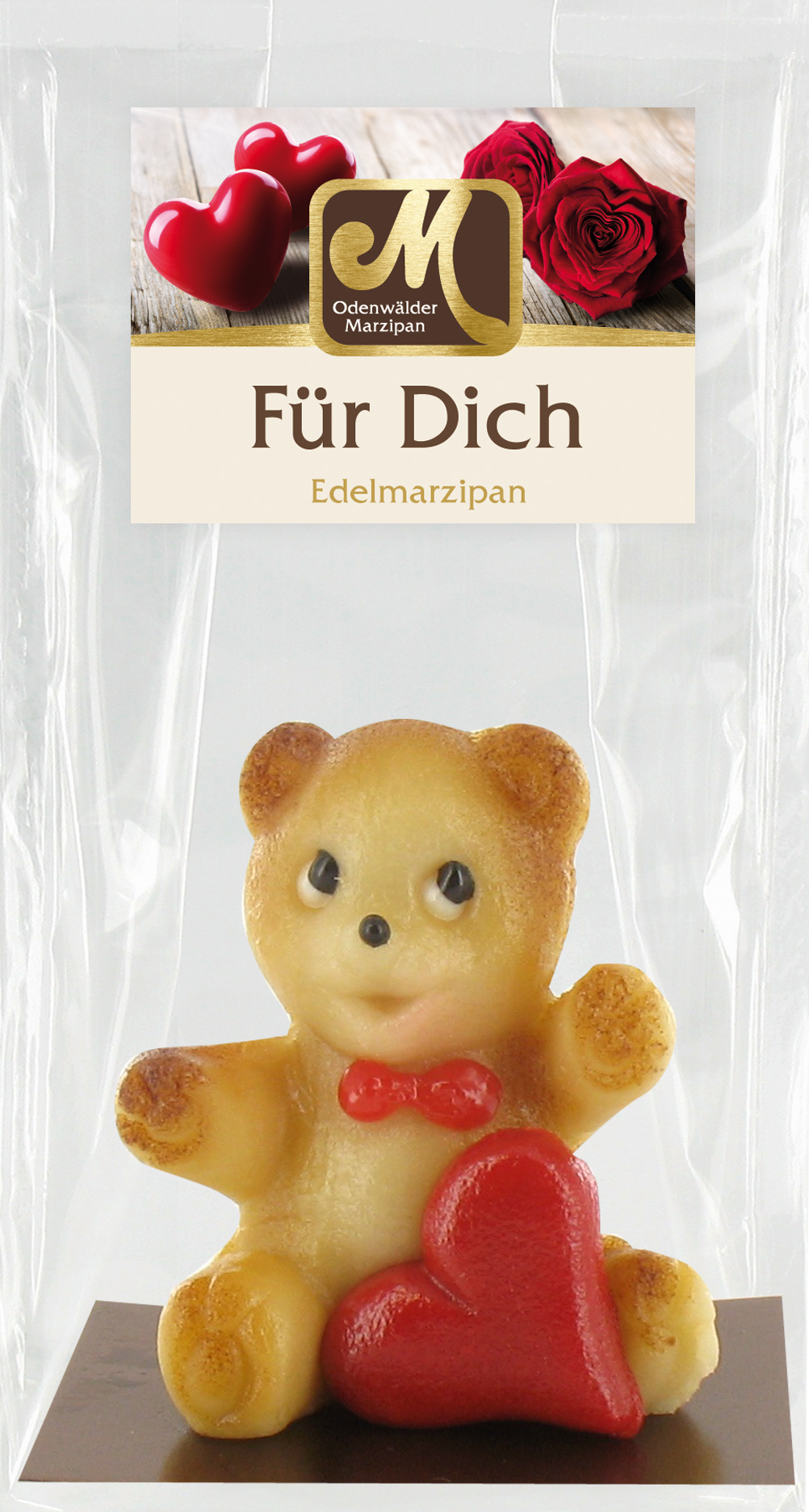 Kommt von Herzen… Unser Bär aus Edelmarzipan ist ein ausgefallenes Geschenk, das Beschenkten sogleich ein Lächeln auf die Lippen zaubert. (Inhalt: Eine Marzipanfigur, Motiv: Herz/Rose ist variabel.)