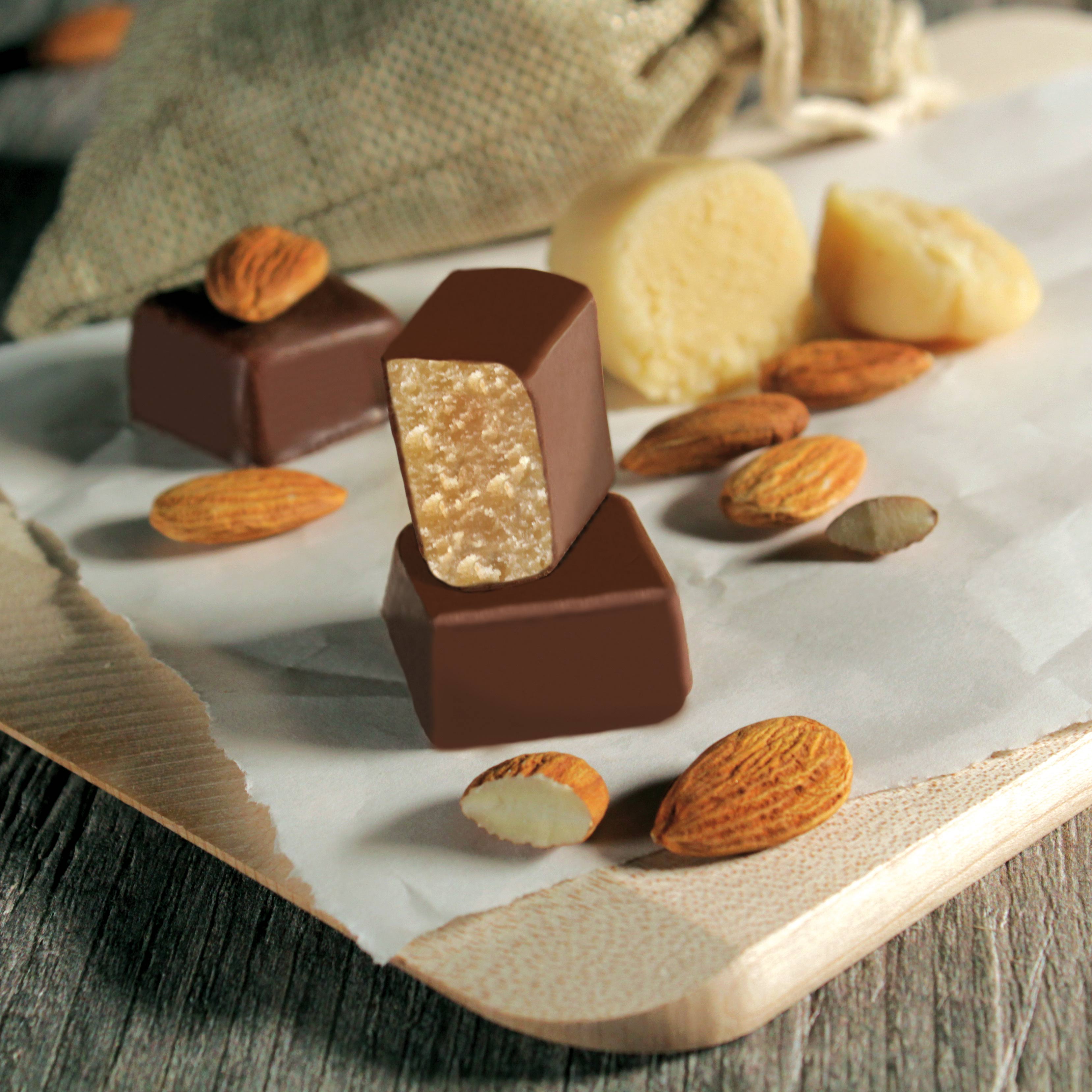 Erleben Sie unsere extra nussigen Nougat Marzipankartoffeln - eine Kombination aus bestem Edelmarzipan, hochfeinem Nougat und einem Hauch Kakaopulver
