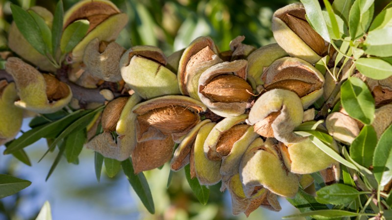 Im Juli springen die Hüllen der Früchte auf und geben die Mandelschalen frei, damit die Schale und der darin enthaltene Kern trocknen. Kurz vor der Ernte öffnen sie sich vollständig.