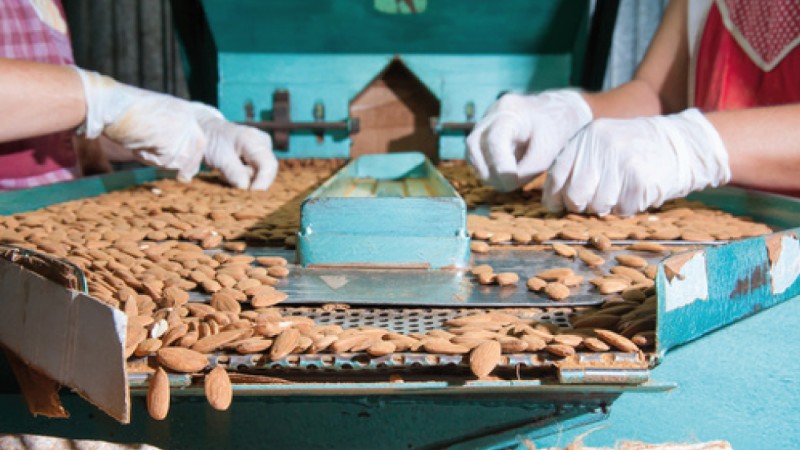 Nach der Ernte kommen die Mandeln in eine Schälanlage, wo Rückstände wie Äste und Blätter von den Kernen entfernt werden. Anschließend werden die Mandelkerne nach Größe und Qualität sortiert