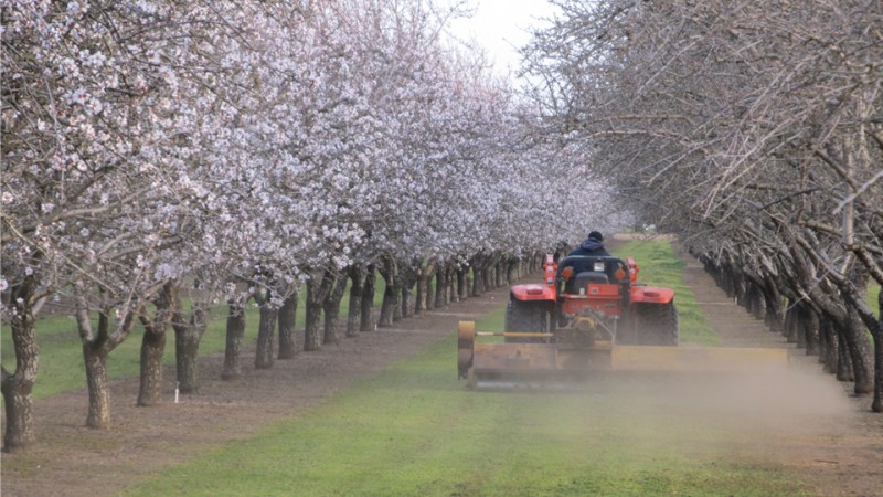 Von Mitte August bis Oktober werden die Mandeln durch kräftiges Schütteln der Bäume geerntet. Nun trocknen diese noch für sieben bis zehn Tage in der Sonne, bevor sie zusammengekehrt und auf Transportwägen gepackt werden.